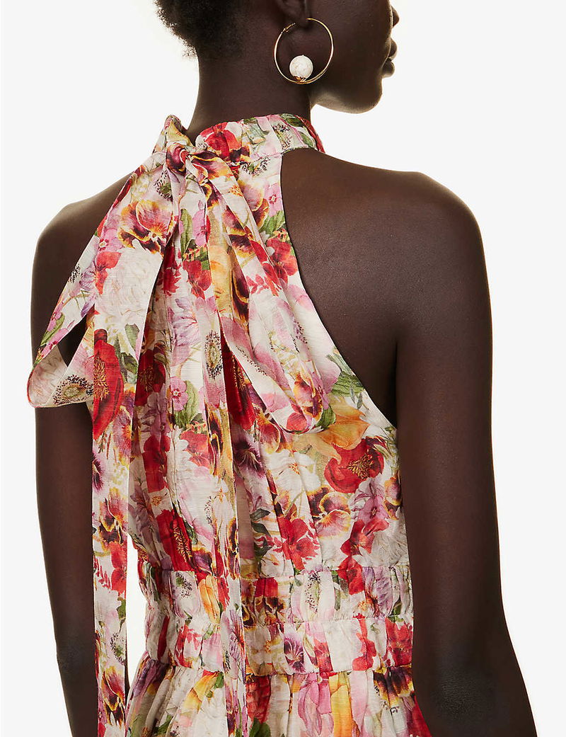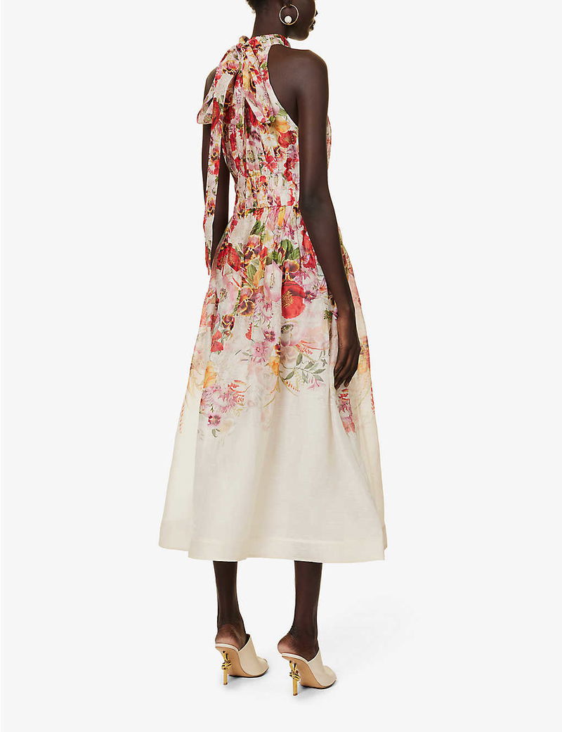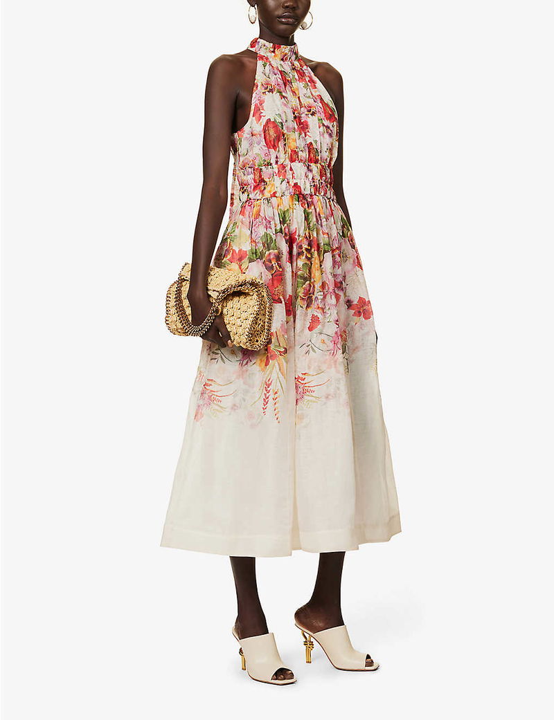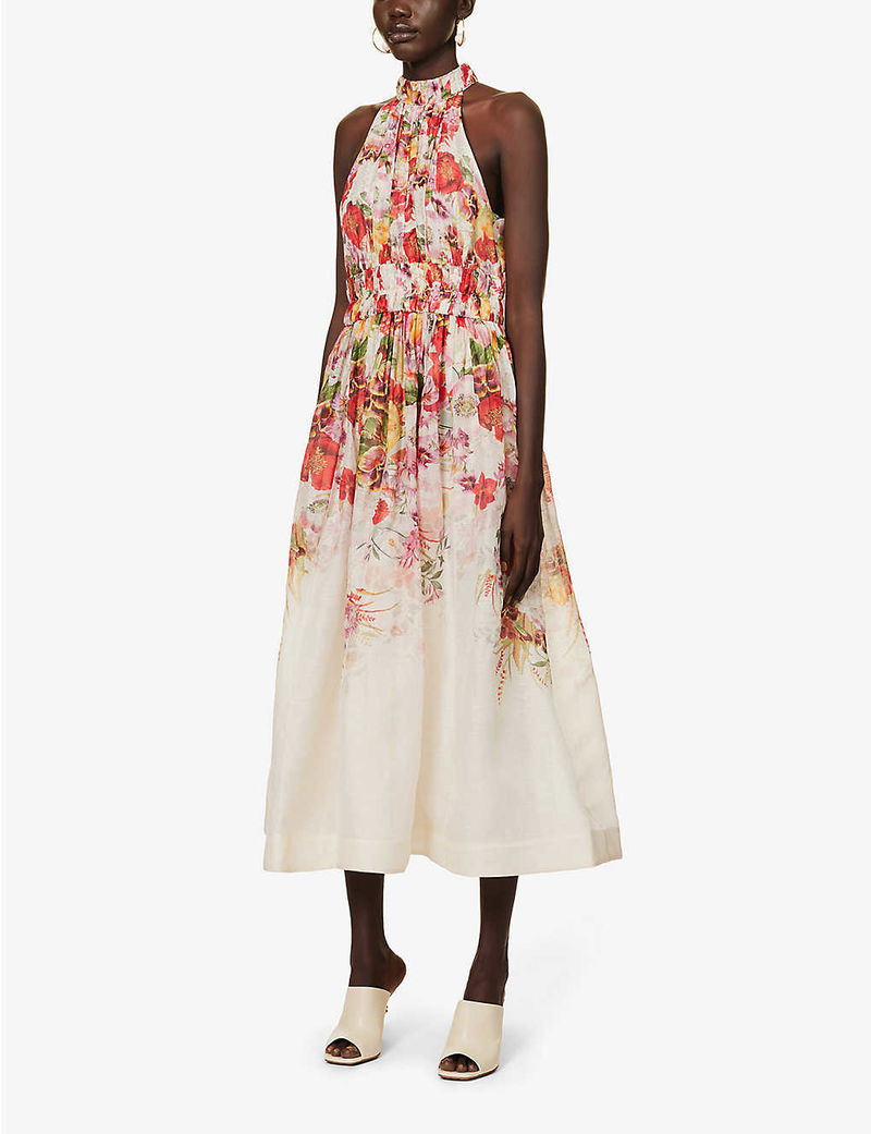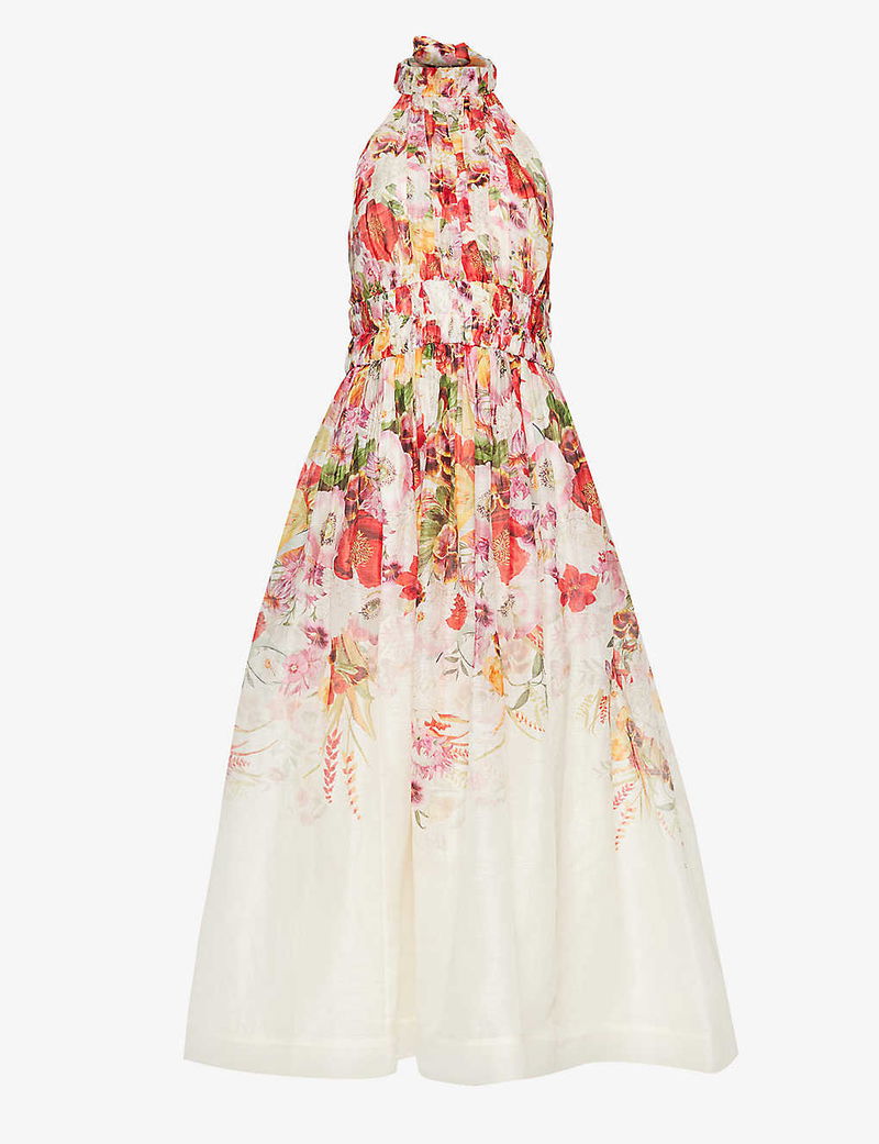 Zimmermann linen and silk-blend maxi dress. How to step straight into the pages of an English fairy tale? Slip on the Wonderland midi dress by Zimmermann and stories of waistcoat-wearing white rabbits, painted roses and mad hatters marooned in a perpetual tea party will write themselves. Primed for ambling across enchanted landscapes, this curious creation is spun from a sumptuous linen and silk blend and topped with a halter neckline before falling to a petal-fine, flounce hem swathed in bunches of sun-dappled blooms.