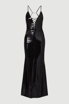 Sequin Power Mesh Lace Up Front Halter Neck Split Detail Maxi Dress