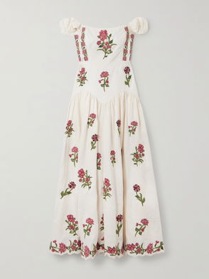 Alheli Petalo Off-The-Shoulder Embroidered Linen Maxi Dress