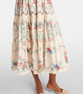 Nispero Tiered Embroidered Printed Linen Midi Dress