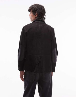Survey Suede Blazer Jacket With Leather Trims In Black