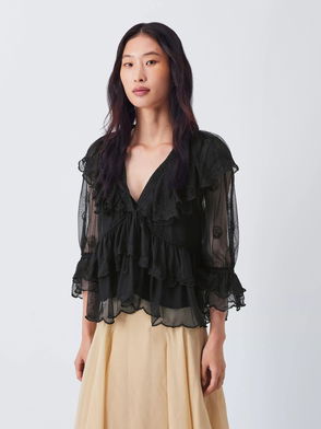 Kiri Frill Hem Tie Neck Top, Blue Multi