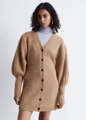 Knitted Scoop Neck Mini Dress With Bell Sleeves In Light Beige