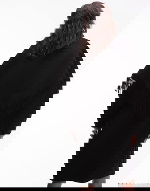 Rich Wool Fringing Tassel Midi Cape Coat In Black