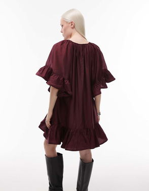 Semi Sheer Mini Dress With Ruffle Edge Sleeves And Tie Neck In Burgundy