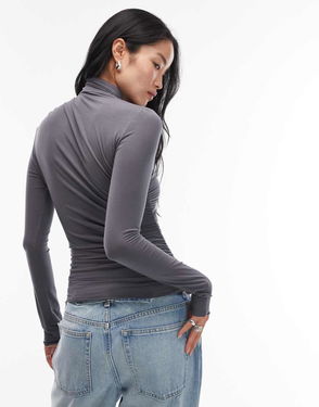 Slim Fit Long Sleeve Turtle Neck Asymmetric Top In Dark Grey