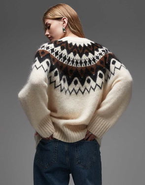 Mohair And Wool Blend Fair Isle Style Knit Sweater With Brown Jacquard Zig Zack Pattern In White