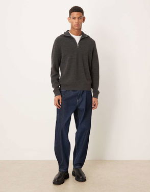 Wool Chunky Rib Jumper With Half Zip Funnel Neck In Dark Grey Melange