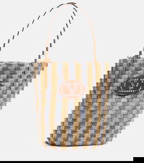VLogo Large Leather-trimmed Striped Raffia Tote Bag