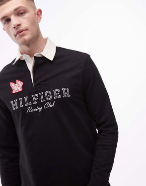 Centre Racing Logo Athleisure Long Sleeve Rugby Polo Shirt In Black
