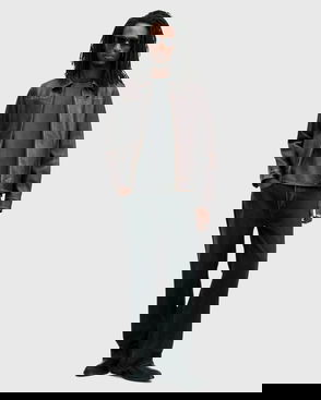 Faux Leather Long Jacket With Contrast Shaggy Trims In Black