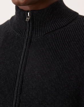 Cotton Knit Collar Zip-Through Cardigan, Black