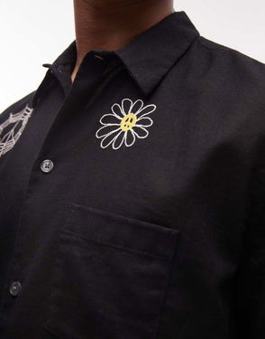 Karlton Short Sleeve Linen Blend Embroidered Shirt In Black