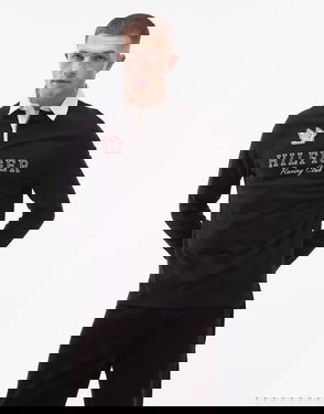 Centre Racing Logo Athleisure Long Sleeve Rugby Polo Shirt In Black