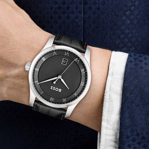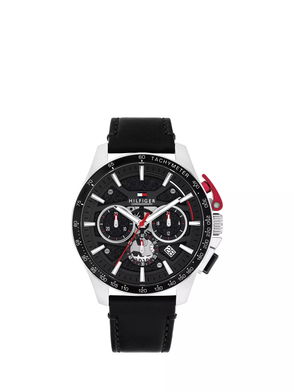 1710725 Men's Stainless Steel Leather Strap Watch, Black