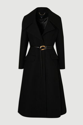 Brushed Wool Pu Mix Gold Trim Belted Midi Coat