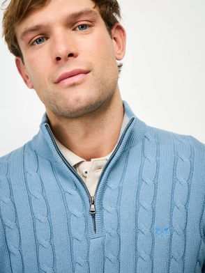 Classic Cotton Half-Zip Cable Knit Jumper, Aqua Blue