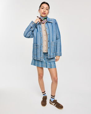 Dawn Pure Cotton Pinstripe Pussybow Bell Sleeve Mini Dress In Blue