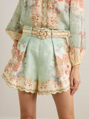 Daylight Belted Scalloped Pleated Printed Linen Shorts
