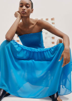 Silk-Blend Shirred Full-Length Dress + Strap Topaz Blue