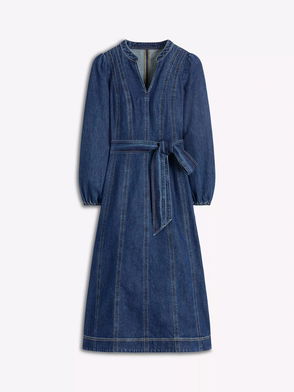 Ros V-Neck Panelled Denim Belted Midi Dress, Indigo Blue