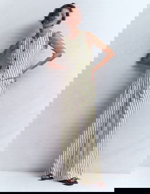 Linen Scoop Neck Waistcoat-Olive, Ivory Stripe
