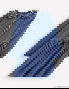 Denim Embroidered Collar Dress-Mid Vintage Denim