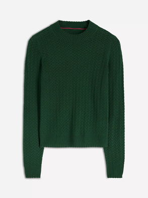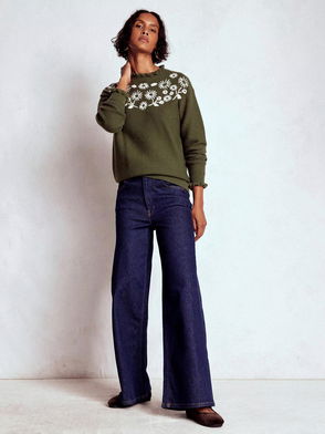 Embroidered Frill Wool Blend Jumper, Green Melange