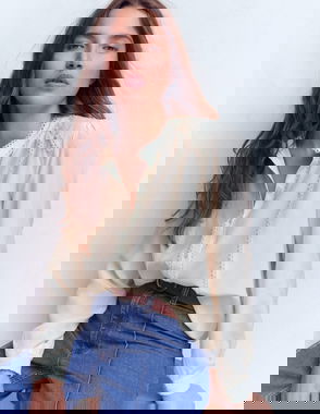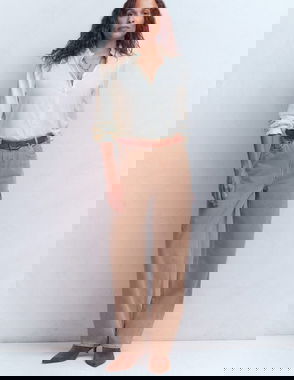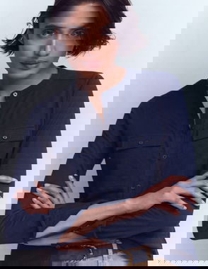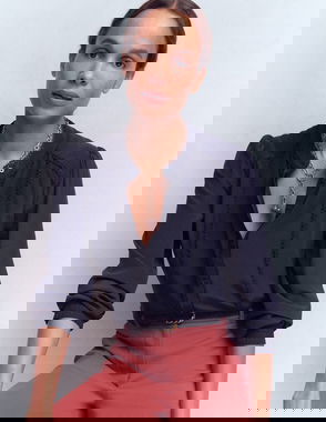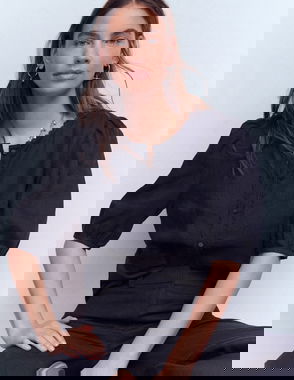 Notch Neck Linen Trim Top-Blue, Elaborate Terrace