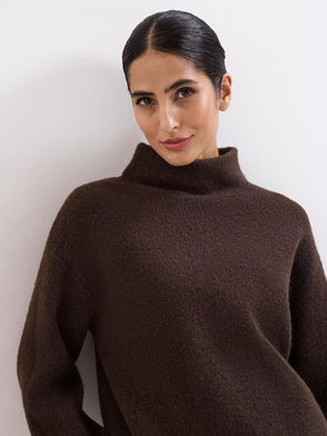 Knitted High Neck Tie Waist Jumper In Dark Brown