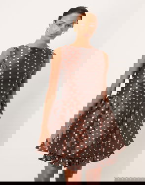 Screenplay Boat Neck Volume Skirt Mini Dress In Chocolate Polka Dot