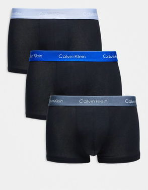 Icon Cotton Stretch 3 Pack Low Rise Trunks In Black With Blue/grey Waistbands