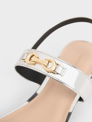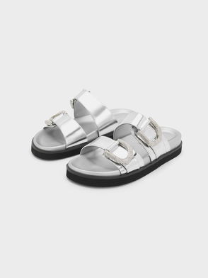 Gabine Crystal-Embellished Buckle Metallic Leather Slides