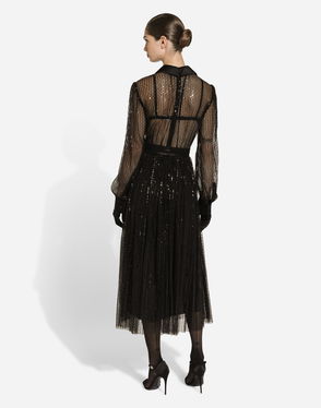 Calf-length Tulle Tuxedo Shirt Dress With Sequin Embellishment