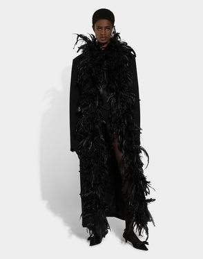 Double-breasted Wool Crepe Coat With Belt And Rooster Feather Embellishment