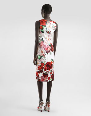 Sleeveless Satin Calf-length Dress With Rose Print