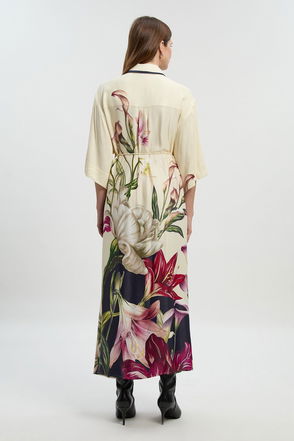 Silk Cotton Floral Print Woven Belted Maxi Shirt Dress