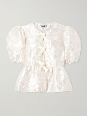 Bow-Detailed Gingham Crinkled-Taffeta Peplum Blouse
