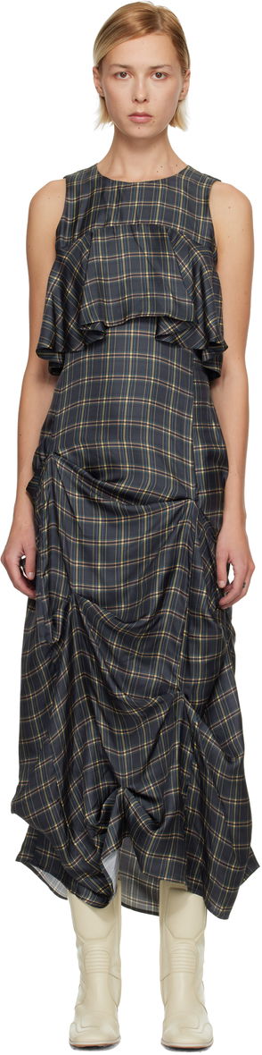Navy Check Ruffle Midi Dress