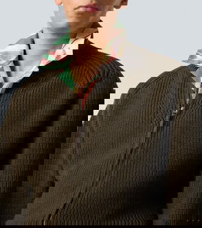 Knitted Fitted Sweater With Sculptural Sleeves In Dark Khaki Green