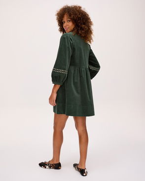 Dark Green Corduroy Embroidered Sleeve V-Neck Mini Dress