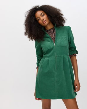 Dark Green Corduroy Embroidered Sleeve V-Neck Mini Dress
