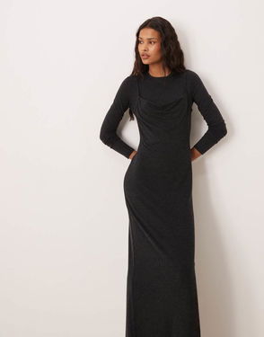 Long Sleeve Maxi Dress With Overlay In Dark Grey