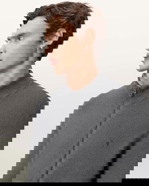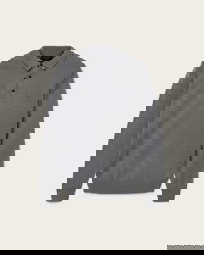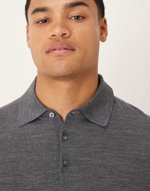 Wool Button Up Long Sleeve Knitted Polo Top In Charcoal