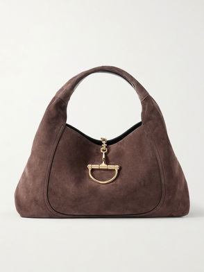 Horsebit-detailed Leather-trimmed Debossed Suede Shoulder Bag