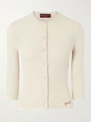 Embroidered Lace-trimmed Ribbed-knit Cotton Cardigan