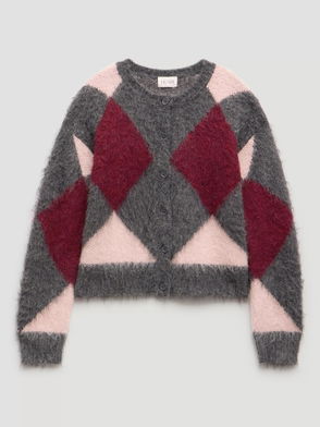 Crew Neck Argyle Cardigan, Charcoal Marl Mix