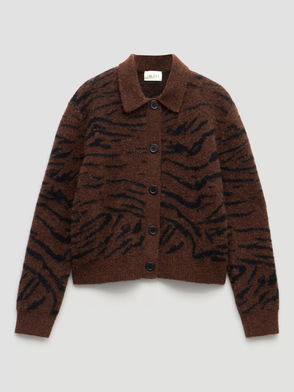 Wool Blend Animal Print Collar Neck Knit Cardigan, Dark Brown