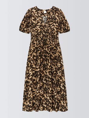 Tortoiseshell Short Sleeve Shirred Waist Midi Dress, Tortoise