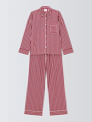 Mixed Stripe Button Through Brushed Cotton Long Pyjama Set, Red/Pink